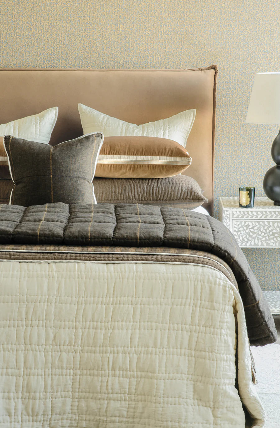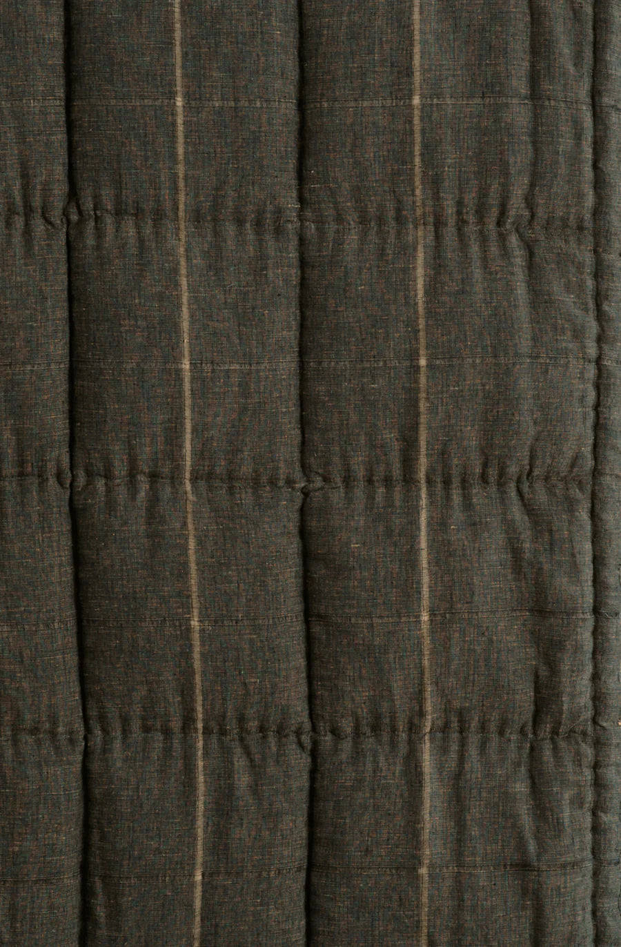 A finely woven chocolate linen chambray unfolds across this soft, puffy comforter in copper, hazel and chocolate hues. Tobiishi chocolate’s visually textured look on both sides adds depth and complexity to its appearance. A fitting choice for building a warm environment that is dynamic in contrasts and accents.